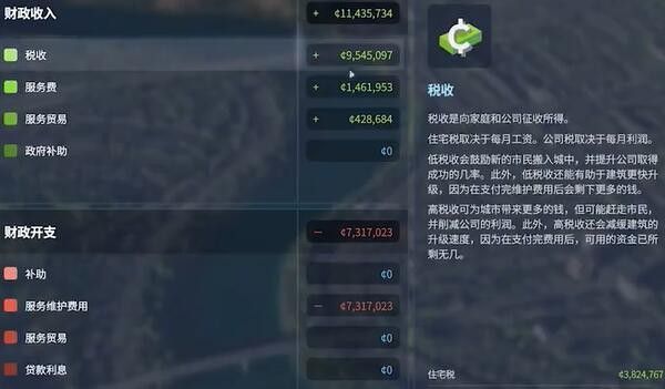 城市的具体金额收入等等在点击绿色的金钱标识后可以查看,还可以查看城市的发展将曲线!受欢迎程度等等十多种数据类型!