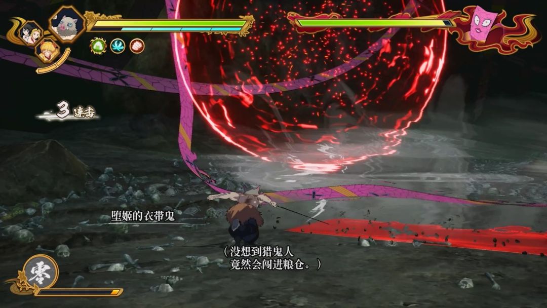 进入战斗后,由于是故事模式的前期阶段,整体难度偏低。堕姬以衣带为武器进行远程攻击,玩家需通过〇键的闪避动作来躲避攻击并逐步接近,寻找其破绽时机进行连击。