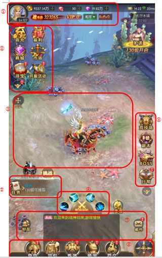 ①玩家信息区,包括玩家等级、血量、战力、金钱、钻石数据等;