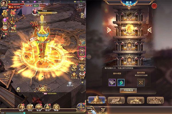 点击“副本”-“试炼之塔”按钮,即可打开试炼之塔界面。挑战试炼之塔可以获得大量经验和金币奖励。每10层的关卡还有额外的宝箱奖励!
