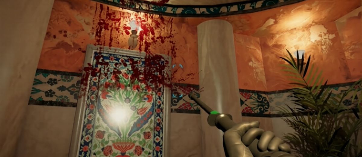 5、在里面光线较暗的房间中,点击开启紫光灯,清理鲜红的痕迹。
