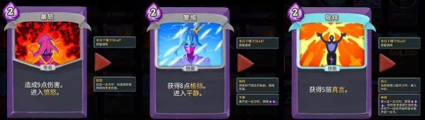 观者牌库最大的特点是【姿态】,能够让自己切换不同的状态来战斗,包括初始啥也没有的【无姿态】,以及通过卡牌效果进入的【暴怒】【平静】【神格】三种姿态。