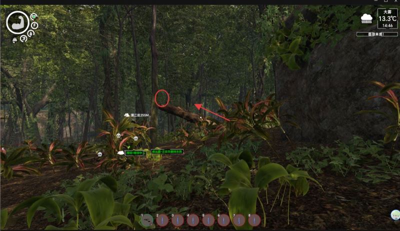 三十一号很简单哈,我们直接找到这个地方 就在怪物刷新点周围 一块岩石旁边一根接近80度插在地面的枯木,枯木不用跳直接可以走到最上面,
