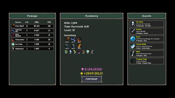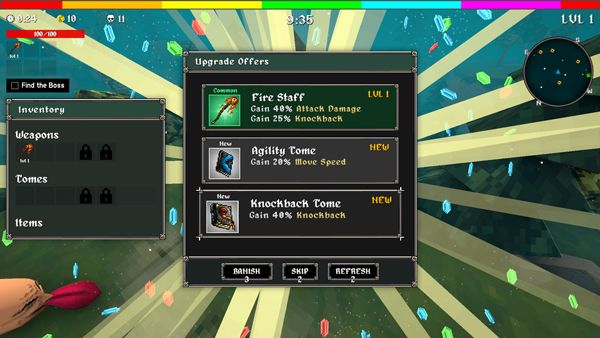 击败敌人获取 XP 来升级!打倒的越多,XP 越多。每次 upgrade 都是随机的,并且有不同稀有度,让每个 run 都独一无二!