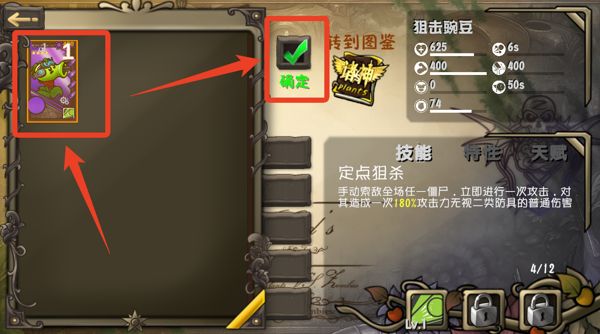 2)选中植物点击右边绿色的【确定】就可以了,你可以查看这个植物的技能和属性。