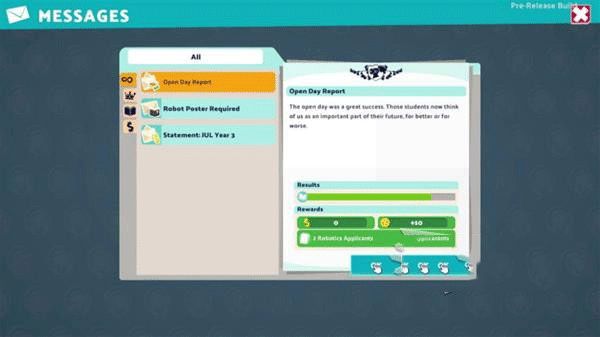 1、玩家的邮箱中有时会出现举办开放日的请求,接受后,校外人士会进来考察某一课程的开设情况,达到他们的要求后即可获得赞誉奖励。