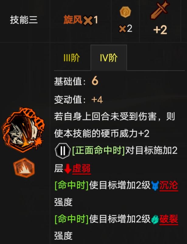 这个技能的基础威力为6,并且有两个硬币,每个硬币的值为4。当技能进行拼点或即将造成伤害时,技能硬币可以翻转为正面或反面,这将决定最终威力。上述技能的基础威力为6,这意味着如果两个硬币都是反面,技能的最终威力将是6。然而,如果技能的两个硬币都是正面,则技能的最终威力将达到14,6+4+4。