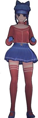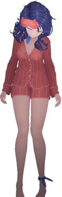 瞌睡米塔有一头凌乱蓬松的头发,她穿着一套红色条纹睡衣,脖子和脚踝上各系着一条蓝色丝带,头上戴着一个带耳朵的红色 猫形睡眠面罩