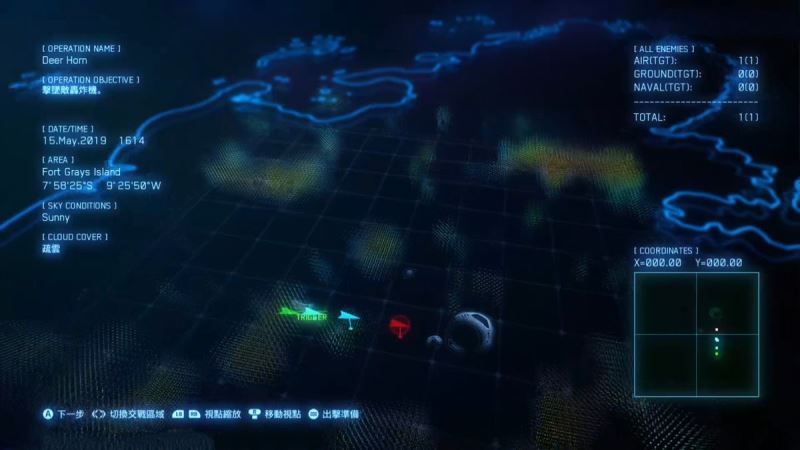 看完剧情后,下图界面是对本次任务的简要介绍。右上角为本次任务的主要目标,游戏中显示为红字TGT,依次为敌机、地面目标和海军数量(注意括号内的数字不代表本关卡会出现的目标数量,正常会有额外目标)。