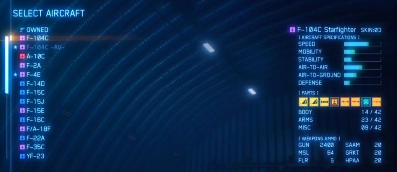 右上角为机体属性,8个槽为可携带的机体配件。右下角为可携带武器的种类和数量,左边为机体自带不用选择,分别为机炮子弹、常规导弹和热诱弹,右边为SP武器(三选一),不同机体SP武器也不完全相同。