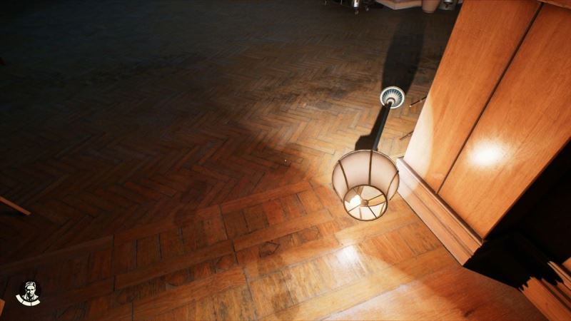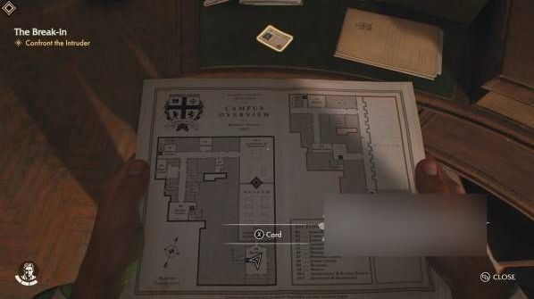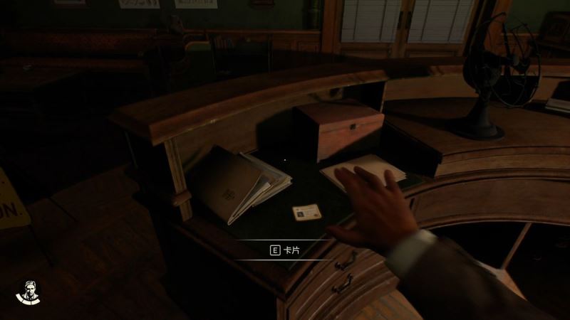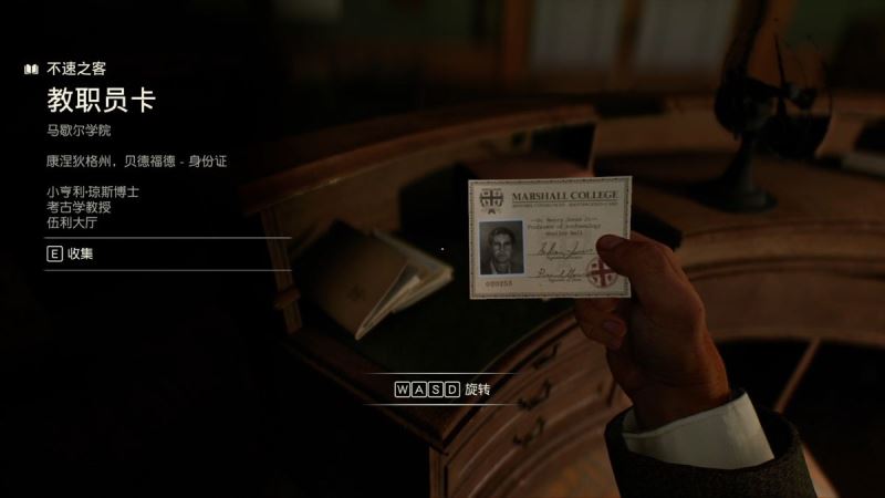 从楼梯上下来,这边有一个圆形工作台,工作台上能找到一张卡片,这个卡片是我们的名片,拿到的道具一般都可以使用WASD来转动方向,这个操作后面会用到。