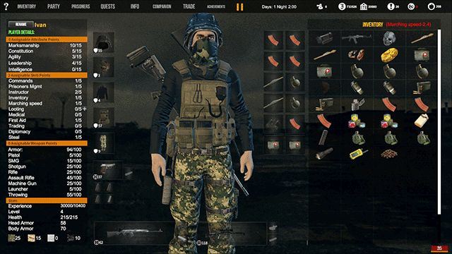 开局我们点完技能再去附近的城市买点东西,你会发现你这点钱啥都买不起,这贵族是有多落魄。我们卖掉金矿石然后买有6个手雷,招募一队战士就可以出去抢 劫了。贸易神马我不太喜欢,赚钱太慢。至于兵我还是选择FCA新兵,大家随意。