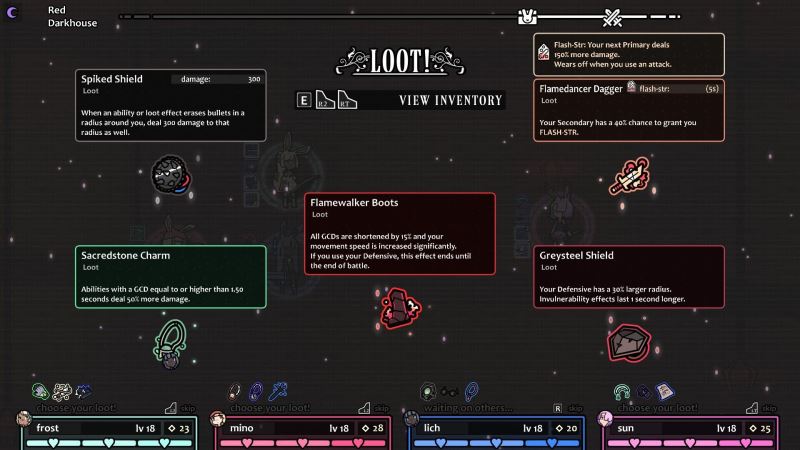 当然了,游戏肯定不会总是打倒挡路的敌人那么简单。一路上要利用战利品和升级设计特定的构筑,才能取得最终的胜利。某些物品配合使用效果特别好……所以千万别让队友抢走了你特别需要的东西!