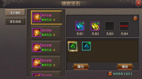 选择装备后,可点击宝石栏里相应的宝石可进行镶嵌;选择装备,点击孔位里的宝石可进行摘除。