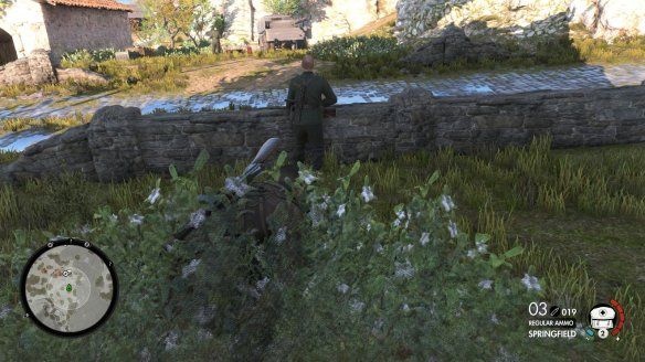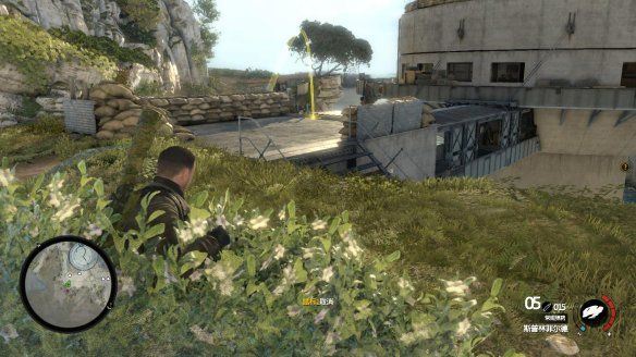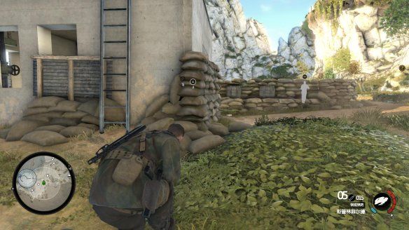 通过小路后将遇到一个地堡,等待地堡左侧敌人背对我们,快速的匍匐前往堡垒右侧草丛,会有瞬间的警戒值。