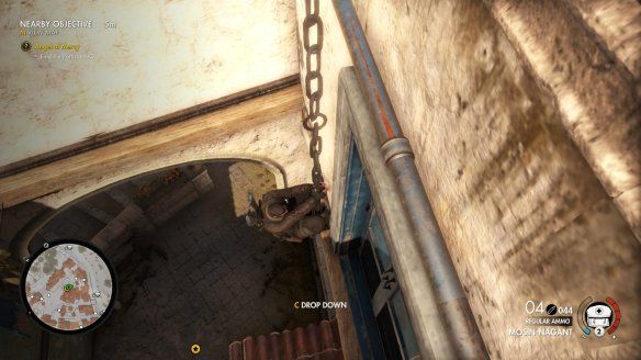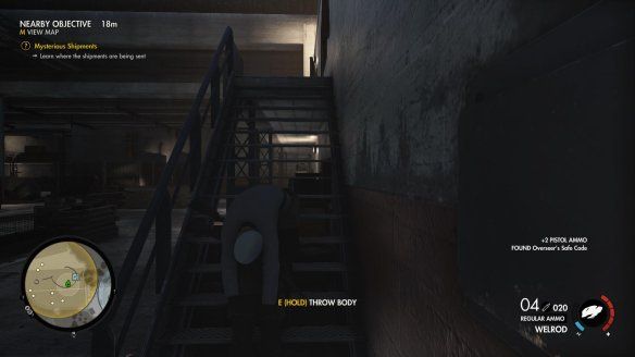 选择任务"Kill Rothbauer",前往目标人物所在的房内,会有一个敌人在楼下进行巡视,可用消音手枪将其杀死。