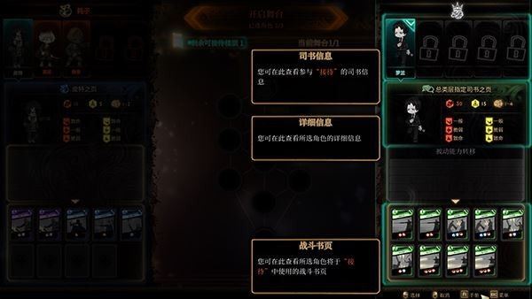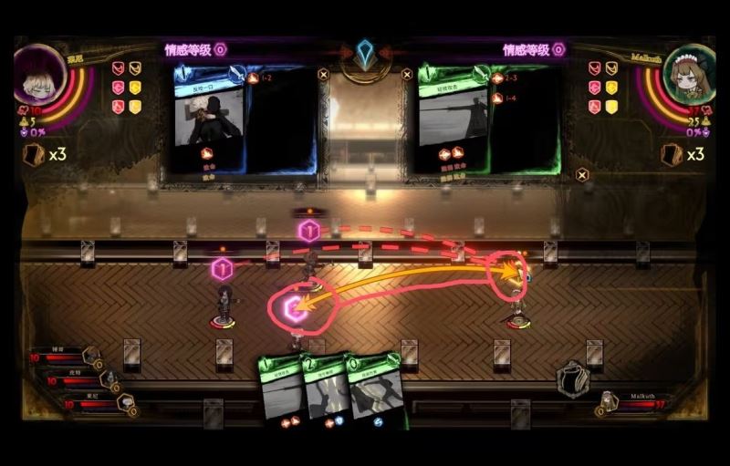 看到这个实心双向箭头了吗,出现这个的两张书页就会在开启战斗后进行拼点。而图中另外两名敌人的红色单向虚线箭头就意味着单方面攻击,我方没有特殊情况就会“白挨打”(如果是我方单方面攻击敌方,箭头会是蓝色实线)