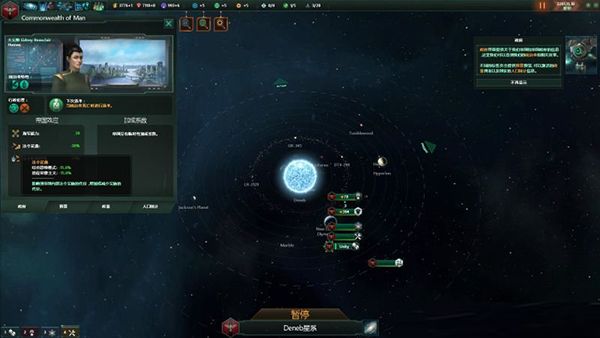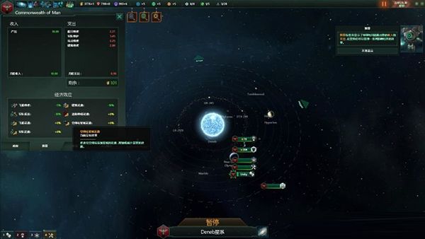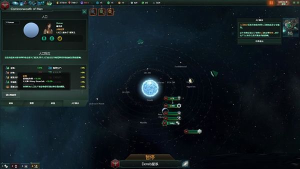 4、各项数值:可居住值(其百分比表示宜居程度)、能量值(①能量用来建造或升级星球、②为小型空间站提供动力)、矿物值(①建造或升级小型网络、②建造小型空间站)、食物(为人口以及农场提供伙食)、物理研发值(用以研究新的技术)、社会研究值(用来研发新的社会技术)、工程研发值(用来研发新的工程技术)、