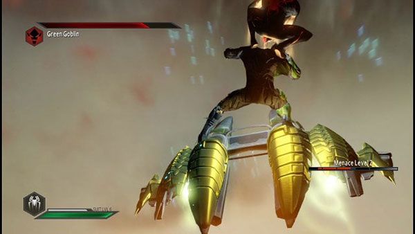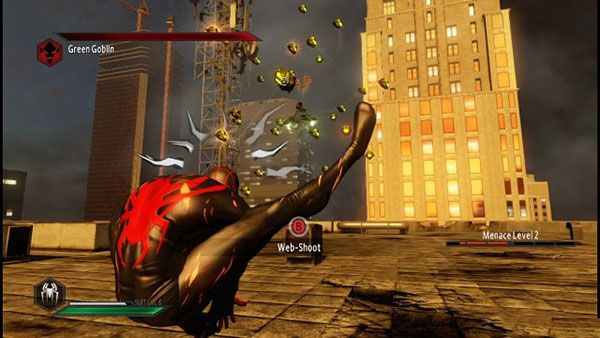 9、绿魔会站在飞行器上对蜘蛛侠投掷大量的炸弹,此时按Y键搭配左摇杆回避,然后面向密集的炸弹按B键吐去蜘蛛丝。