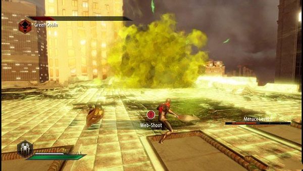 11、最终绿魔会返回到楼宇顶上,此时绿魔会释放绿火,只需要按Y键即可躲避。然后绿魔的攻势同样是投掷一大批炸弹,先对这群炸弹吐蜘蛛丝,然后捡起地面的两颗炸弹往绿魔身上砸去,然后痛揍他几顿就可以将他收拾。