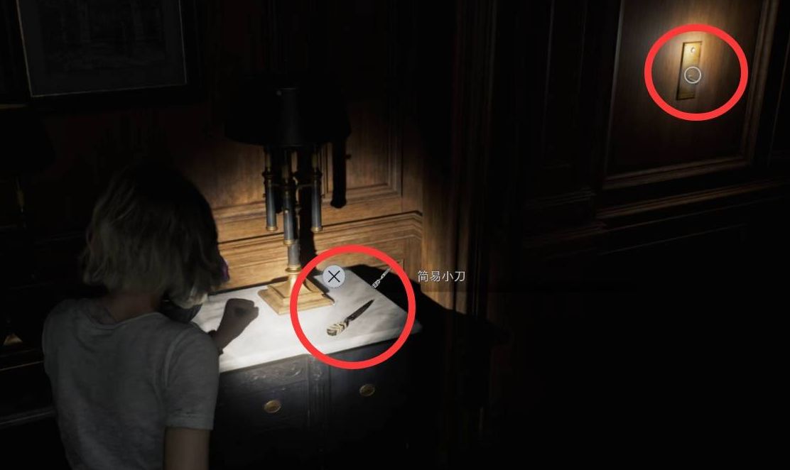 穿过厨房开门后左拐,可以在西面的桌上拿到简易小刀。拿到小刀后,打开灯吸引光敏丧尸过来。