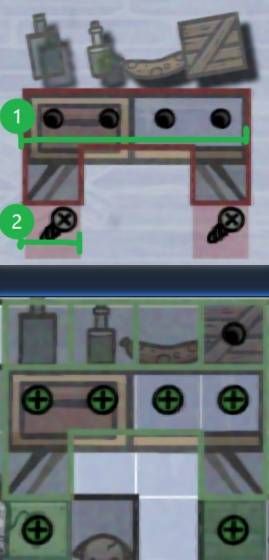 如图所示,家具的(1)提供了4个孔洞位置,能够让上面四个小物件的"螺丝"放进去,所以只要让这个桌子满足摆放条件(2)就可以额外获得新的4个位置摆放空间。