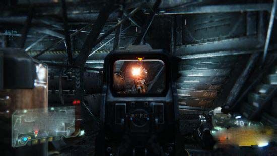 4、好不容易到实验室的门前了,突然门炸开,一直小BOSS出来,这时候先离远点,找到远处的系统入侵后注意站位,别被小BOSS的火焰烤了~接着使用重火力消灭。