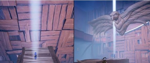 难点四:打开一个新区域后,小梅站在下图位置放分身,等科迪把鹰头放下来,就传送过去,然后科迪把小梅运上去,小梅去对面的台子上踩按钮,下面的玩偶就会继续前进。