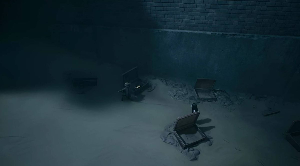 等两名角色都穿过风扇之后,走到尽头与地上的门互动,需要两名角色同时拉住地板门上的把手才能开启地板门,进入地板门来到下层。