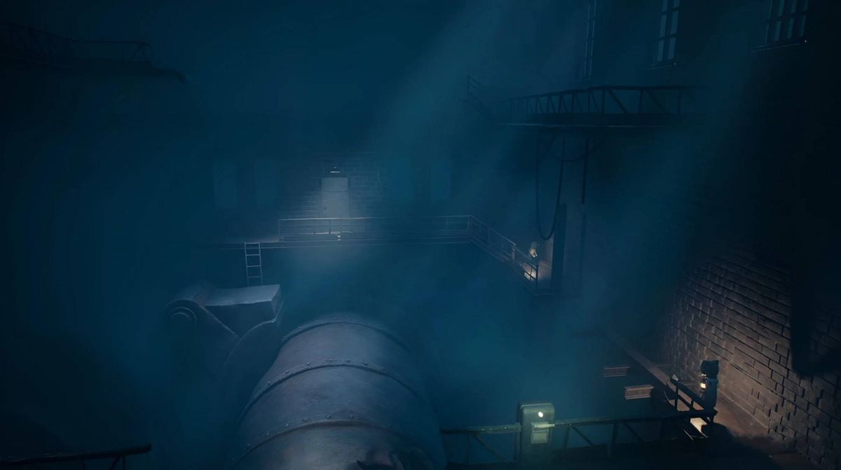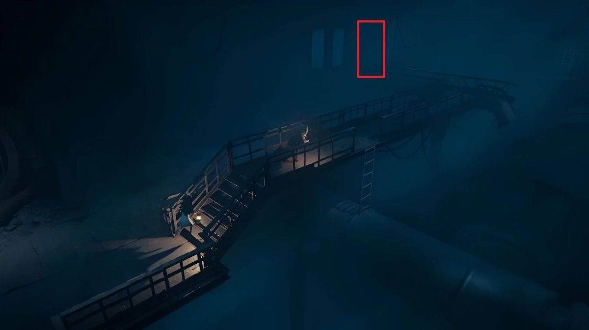 沿着平台继续往前走,爬梯子到上层,上层有两条路:①左侧的路走到尽头开门可以来到室外露台,与露台上的墙缝互动进入房间内,可以在箱子处拾取一个头罩;②往右走的路是主线,走到头的栅栏处可以触发与小伙伴的对话。对话过后继续往右边的桥上走。先不要下梯子,走到桥的尽头左侧开门。