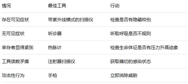 通常不需要着急,所以请慢慢检查幸存者,确保你仔细检查并考虑所有可能性。让感染者进入健康人群的风险是不值得的。
