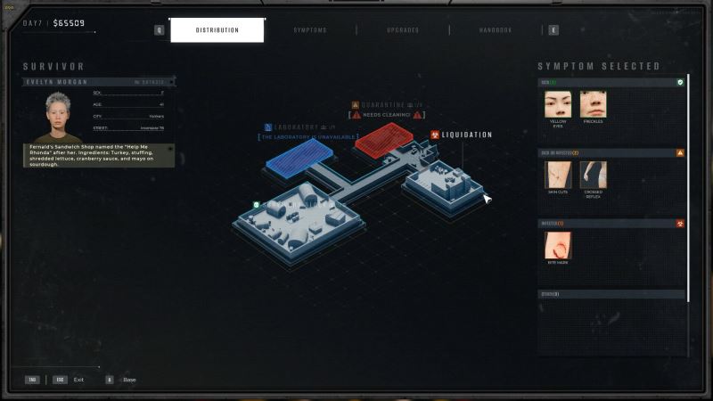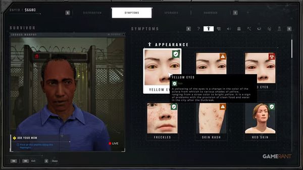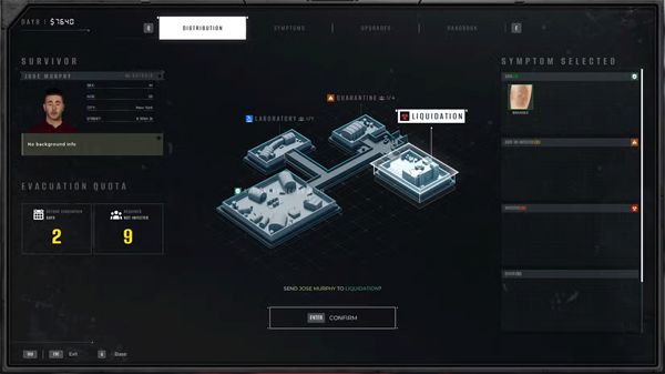 检查完所有可能症状后,打开分发菜单,按(TAB/返回键)。所有明显症状都会显示在左侧。根据这些信息,发送幸存者封锁、隔离或清算。