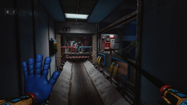 6、开门之后走里面还会有一个开关给他拉下来,往前走进去用蓝色手臂互动一下前面的开关,这里要触发三个开关才能有电流打通出口。