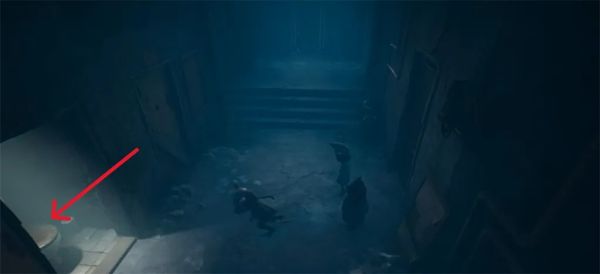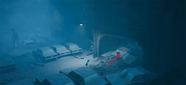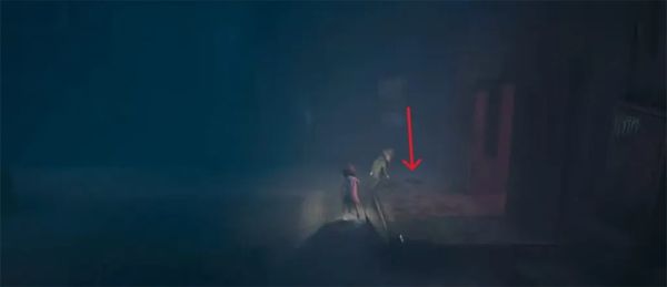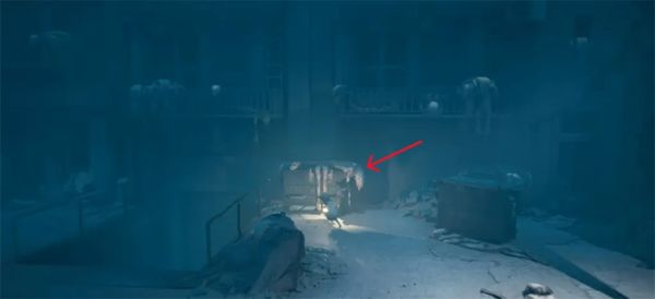 敌人会从尸体里爬出来。躲在桌子底下,他找你。左右移动以避免被发现。他会爬进另一个身体离开。用撬棍从门口出去。一旦走出巷子,进入有红门的建筑。从左边的门进去,回到剧院。撬开左边的木板。