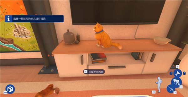 游戏场景中还有小猫咪以及各种角色摆件,玩家可以抚摸猫咪进行互动。并且,由于多人清洁模式采用多屏同时进行,因此玩家可以看见其它玩家一起清理的画面!