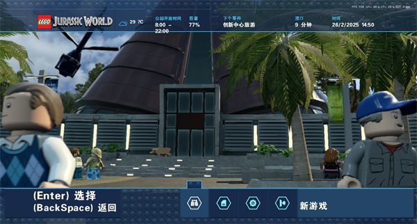 藉由停机坪旁边的高速列车,进入了《侏罗纪世界》的故事模式,从米契尔兄弟格雷与柴克来到了侏罗纪世界主题乐园开始,他们的阿姨克莱儿正一如以往的管理着如今已经营运的非常顺利、世界知名的“侏罗纪世界”这个建造于 22 年前的侏罗纪公园所在的“努布拉岛”上的主题乐园,整顿管理至今已经让岛上比起当年还要朝气蓬勃、风光不少,每日的游客数量也非常的可观。