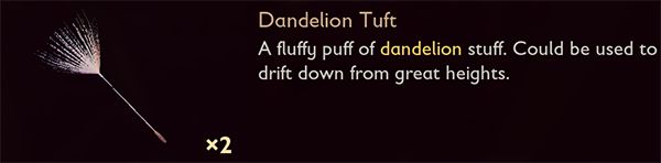 一级斧头可以砍伐。当你从高处跌落时,如果你戴上蒲公英并从高处坠落时按Shift键,你将使您缓慢跌落到地面且不会受伤。蒲公英还可用于建造房屋,例如制作门窗。