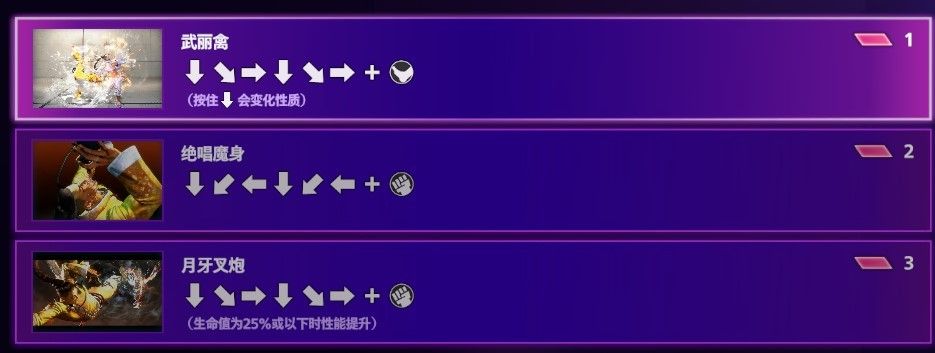 超级必杀技本次不适用斗气槽,为单独的能量槽,以下招表对消耗1格2格3格的超级必杀技简写为C1,C2,C3,其中所有人C3在血量低于25%时都会追加伤害