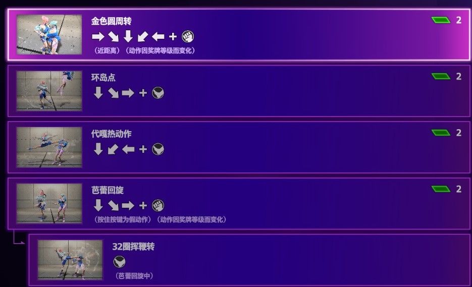 金色圆周转63214P,近距离摔投,抓住对手后旋转将对手踉跄摔出去,动作会因奖牌等级变化,曼侬默认会有一层奖牌,每次用特定投技命中对方都会增加一层奖牌,5层封顶,每多一层奖牌都会增加很多伤害,5层后伤害很恐怖,且奖牌数量不会因为下一灯对局而重置。