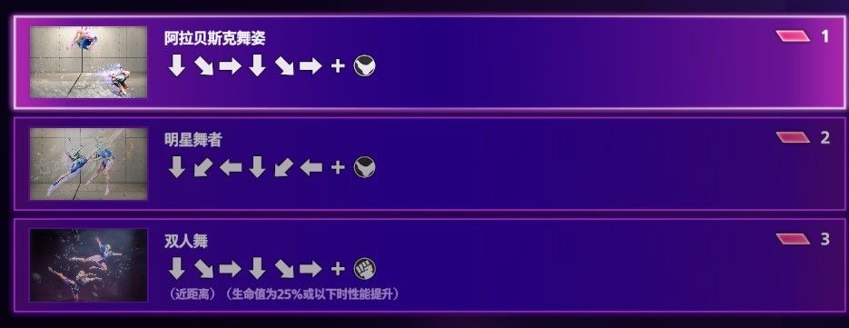 C3 双人舞,近距离投技必杀,抓住对方后一起跳旋转芭蕾最后将地方摔下,25%血量下会有歌声,伤害更高。