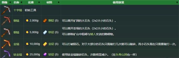 镐主要用于破碎石头,还能回收放置的设备或家具。镐可以恢复锄头已锄过的地块。