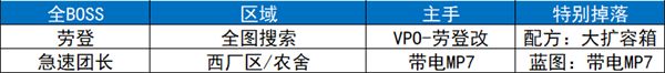 急速团长:不贴脸就一般般。打法:团长的冲锋枪远点极其不准,躲在远处掩体后面突突死他就行,记得拉好距离别被近身。掉最好用的AK103图纸和风暴怪特攻带点MP7。