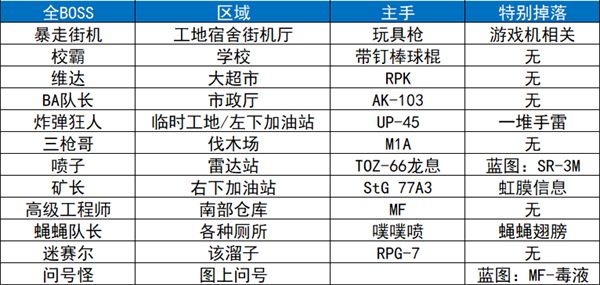 4、维达:在地图中间的大超市里随机刷新,这个boss是五级面罩头和五级护甲的一个boss,打这个boss尽量使用高级穿甲弹。打的时候利用超市里的沙袋,不熟悉地图的可以先进去逛一逛,如果沙袋被摧毁就多利用不可摧毁的掩体来peak他。