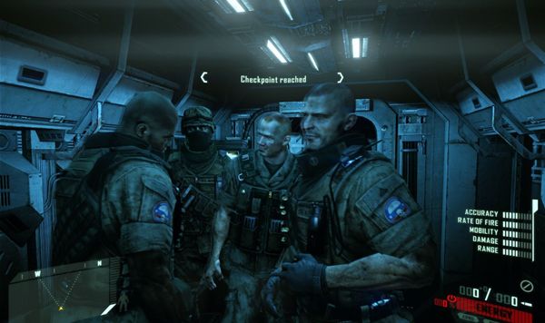 3.克莱尔明白,先知有点失去理智了。刚才有一个声音,一个奇怪的声音说了一句“我是ceph主脑!”于是克莱尔叫出了先知的本名。当先知恢复理智之时,所有异形都对限制发起了攻击。地上这把枪……嗯~~暂时无限子弹,这几个小怪清完了解除。另外,这里能量值也是无限的。可以护甲一直开着……
