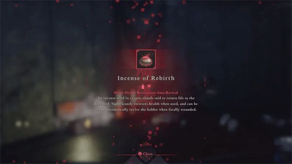 有些物品可以治愈你,而另一些物品会给你增益,比如更好的防御或在一段时间内造成更多伤害。有一个,重生的香,如果你在战斗中死亡,它可以让你复活一次。不幸的是,您一次只能携带一个。