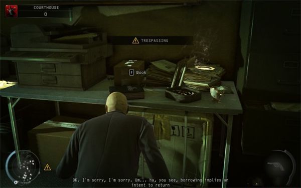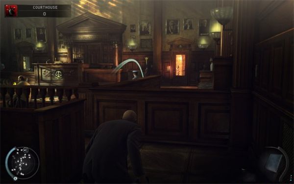 9、开取公认本场景最难的一扇门,进门后不要马上得意忘形去开关底的门。先在如图的位置机动。刚才砸书被引开的首位现在该回来路过通道了。注意在合适的距离左右晃一下让他的目光还没升满就走过去了。好了,现在打开了法庭和监 狱之间的分隔门。恭喜,最难的地方已经过去。