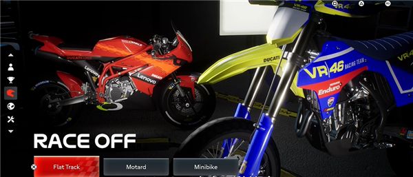 在生涯模式和快速模式中通过全新的Race Off竞赛项目,像冠军一样训练。驾驶Motard、Flat Track和Minibikes摩托车,在2个原创环境中的4条专用赛道上一展身手。接受激动人心的挑战,提升车手体能,解锁配件,磨练技术,主宰赛道!