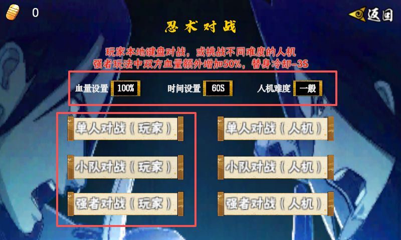 核心玩法:本地键盘对战或人机对战,支持单人/小队/强者三种对战类型,可自定义血量、时间、人机难度。