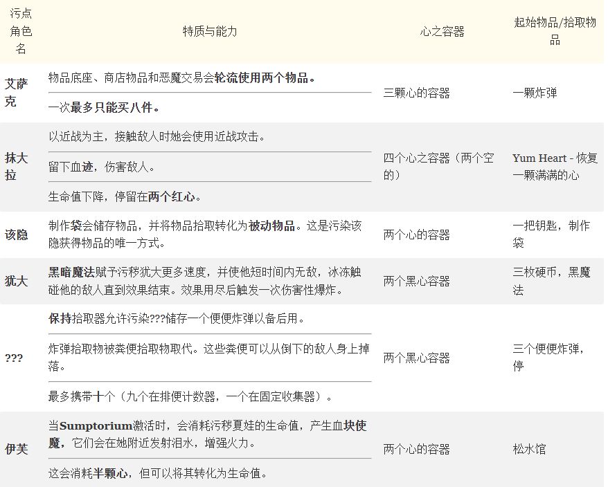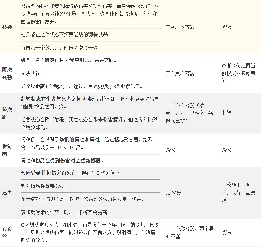 可以肯定地说,《以撒的结合:忏悔》对游戏做出了重大改动,同时加入了大量内容。其中一个新增内容是污点角色。这些角色本身就是独立的角色,通过击败特定Boss会用便签填充。