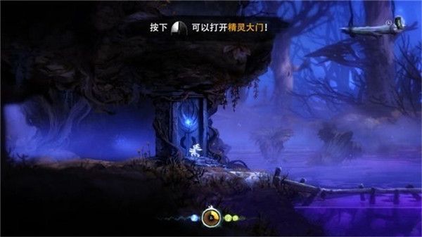 落到底层一直往左侧推进,奥日会看见昔日因纳鲁的离开而消沉的自己的影像浮现在眼前,继续前行会发现一个圣地,在这儿可以获得飞檐走壁(此时就可以回去拿取第五步的能量核心)。